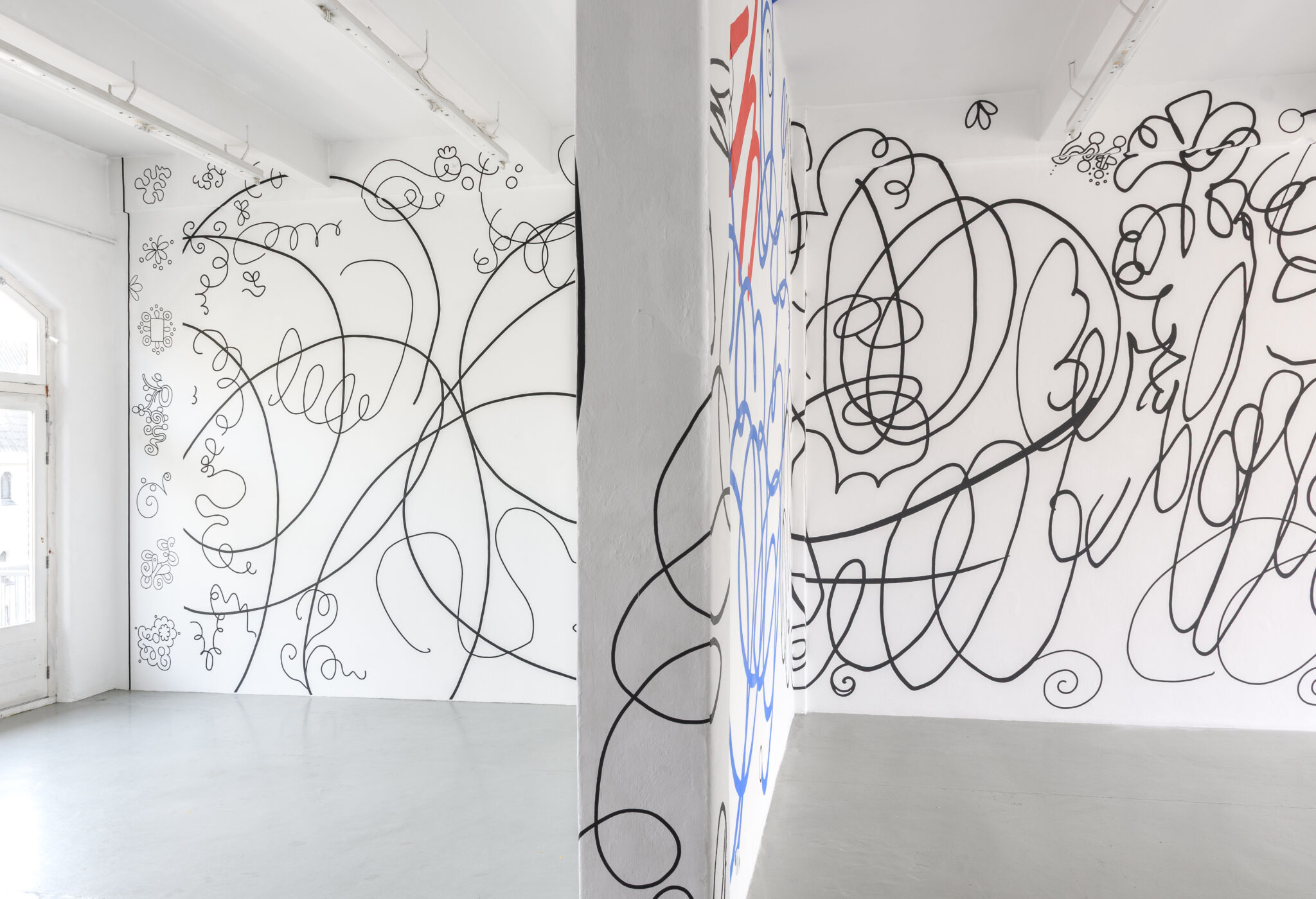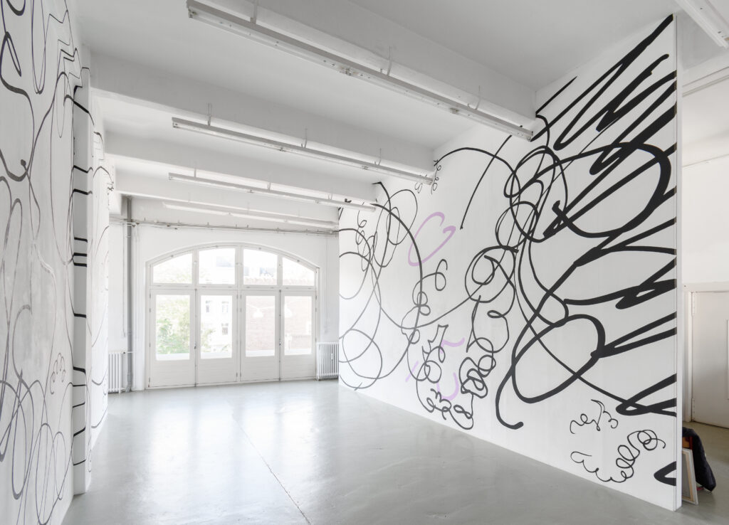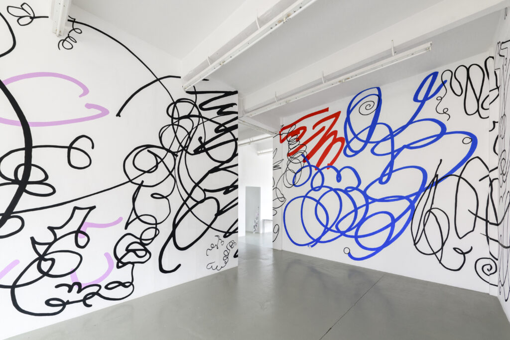 De drie foto’s hier direct boven en de foto bovenaan naast de titel: Lily van der Stokker, Nothing Wall (2025), 440 x 800 cm & 440 x 1700 cm, muurschildering met acrylverf. installatie bij Galerie van Gelder, 20 september 2025 t/m 26 april 2026 (foto: Harm van den Berg)